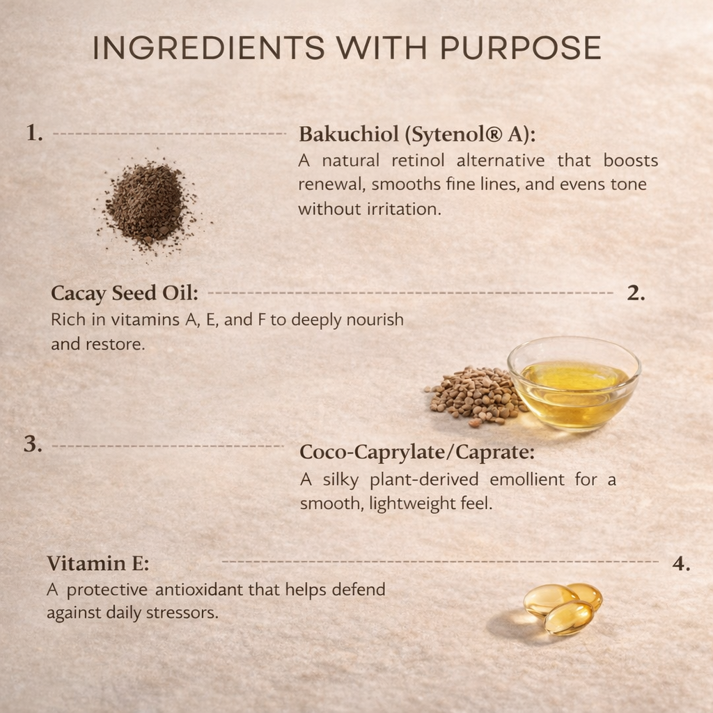 Caprylic/Capric Triglyceride, Caryodendron Orinocense (Cacay) Seed Oil, Coco-Caprylate/Caprate, Bakuchiol, Tocopherols