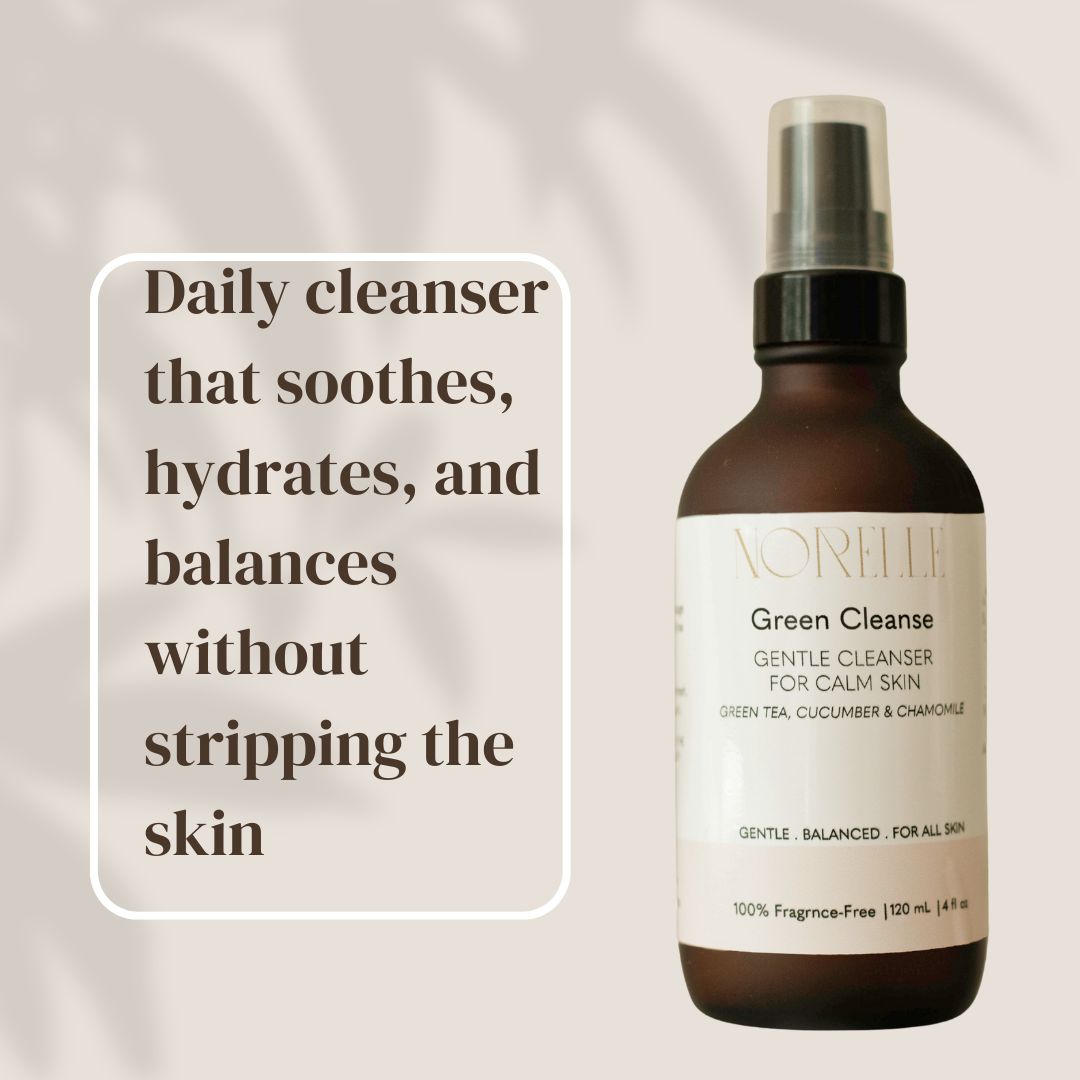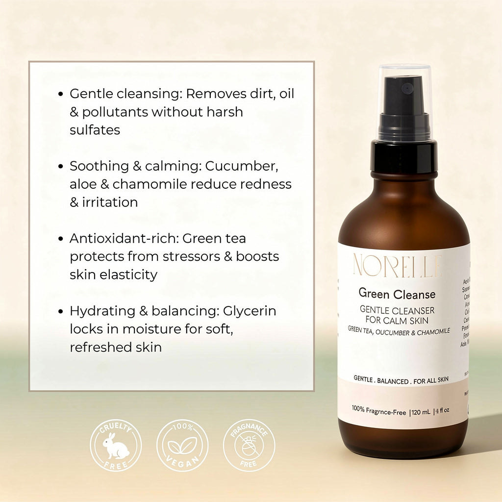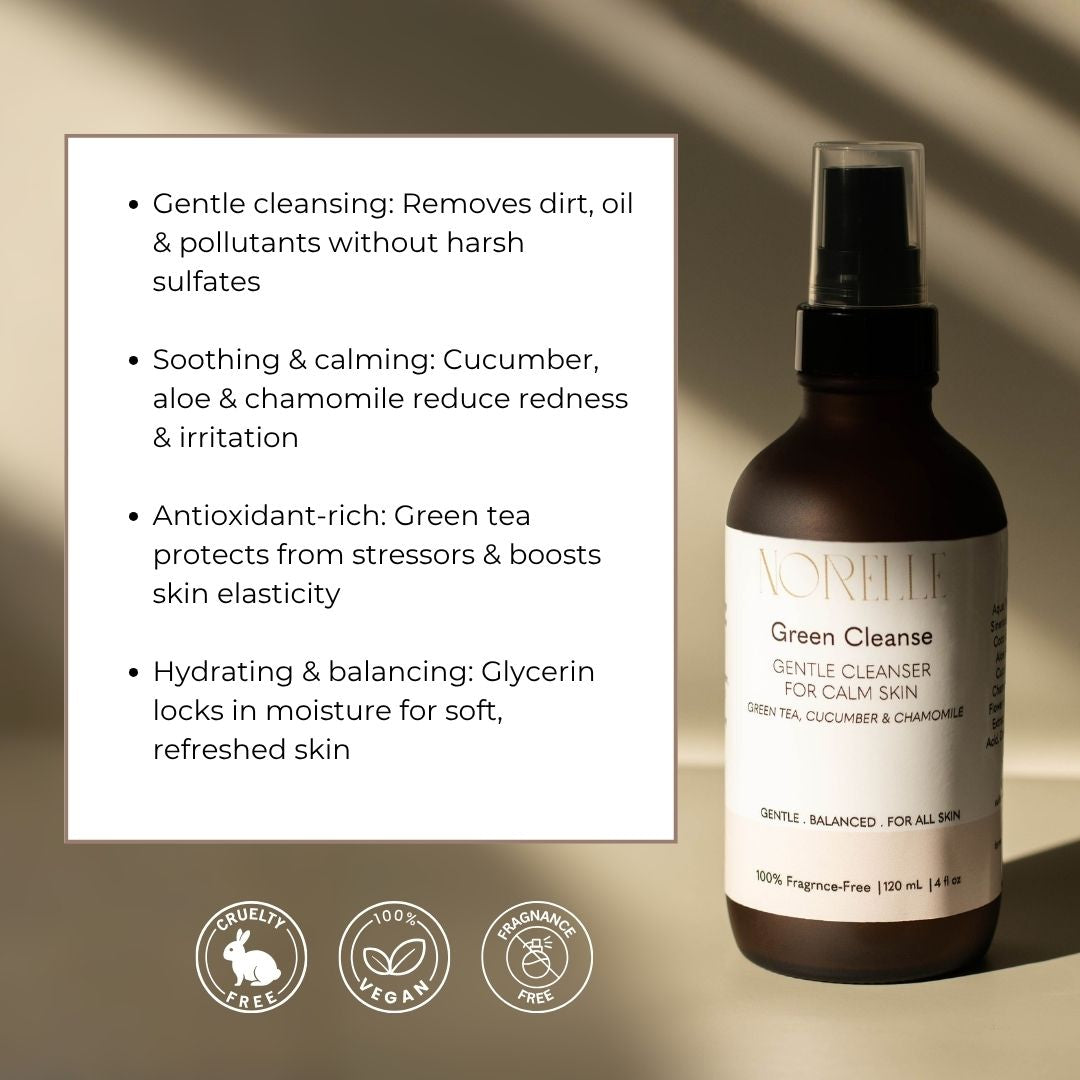 Refresh and soothe your skin with our Green Cleanse, a gentle, plant-based cleanser infused with Green Tea, Cucumber, and Chamomile.