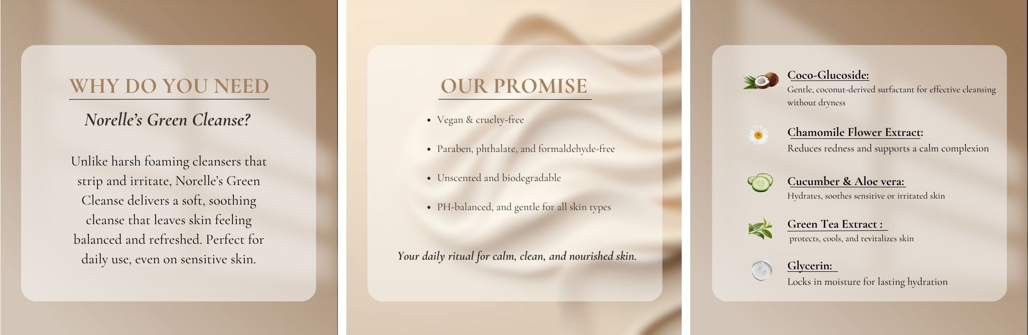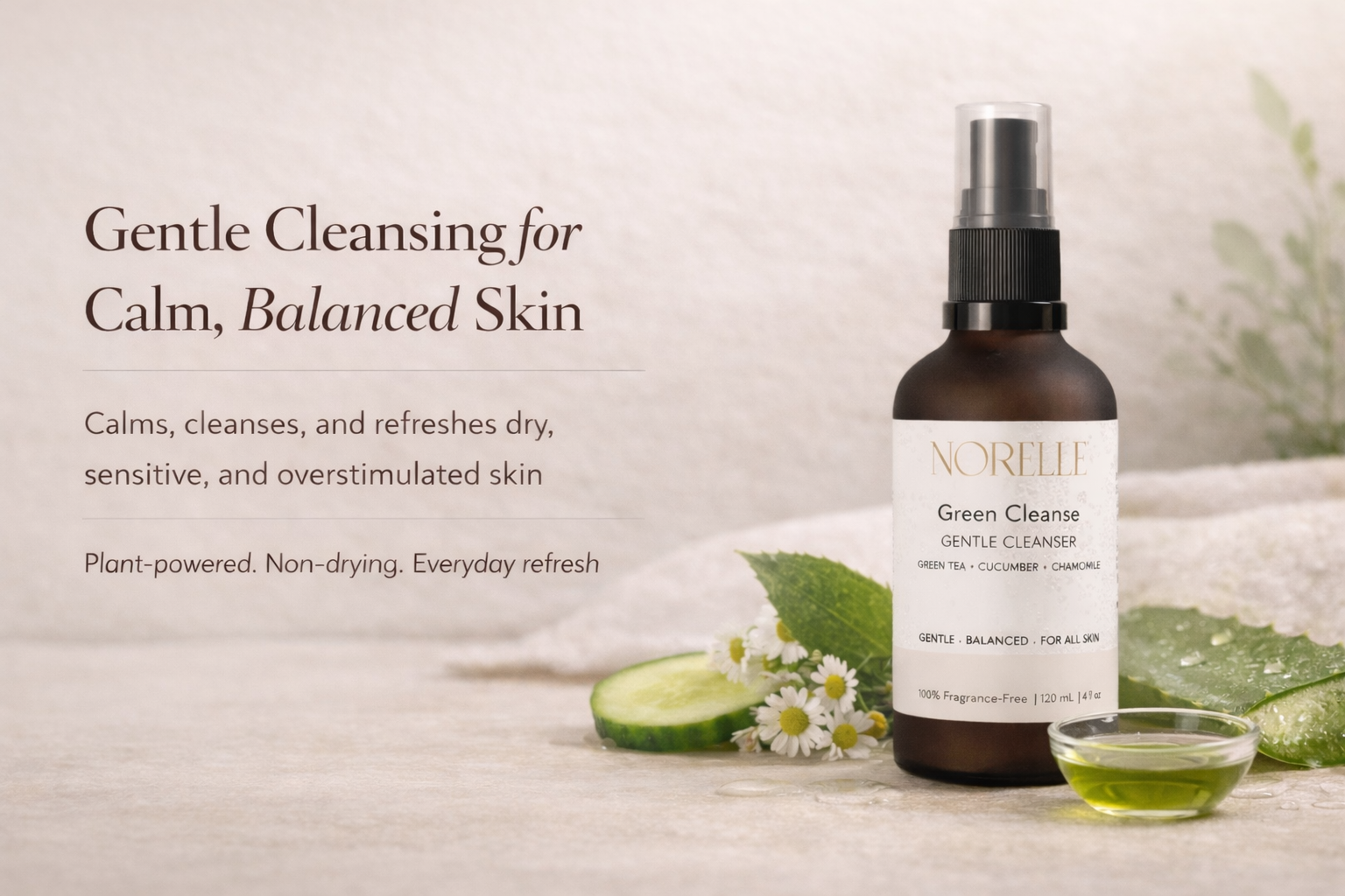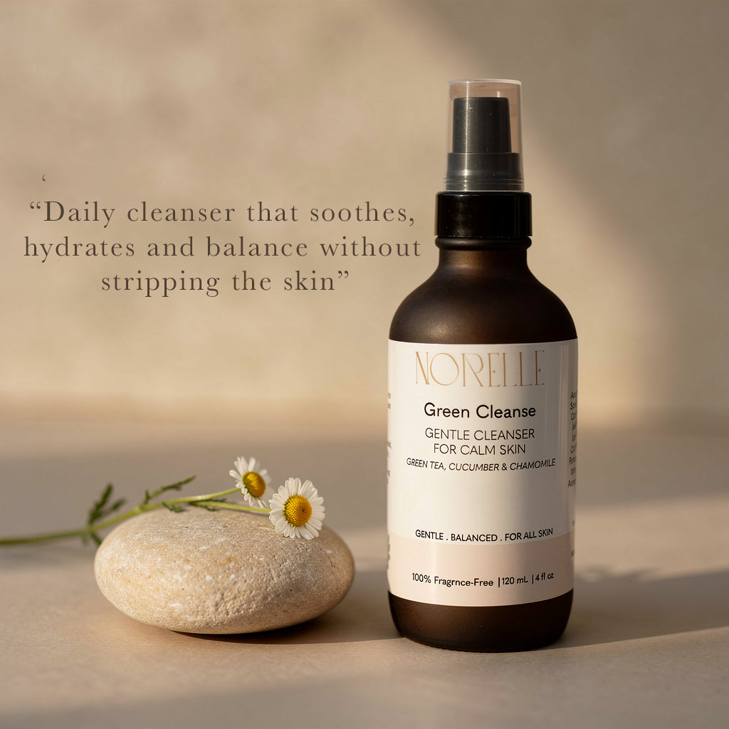 Refresh and soothe your skin with our Green Cleanse, a gentle, plant-based cleanser infused with Green Tea, Cucumber, and Chamomile.