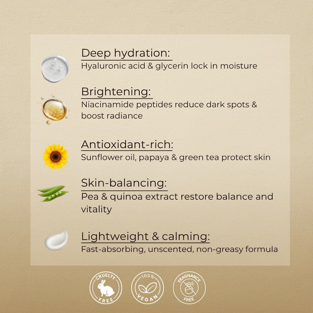 Aqua (Water), Sodium Hyaluronate, Niacinamide, Pisum Sativum (Pea) Seed Extract, Chenopodium Quinoa Seed Extract, Caprylic/Capric Triglyceride, Helianthus Annuus (Sunflower) Seed Oil*, Carica Papaya (Papaya) Fruit Extract*, Camellia Sinensis (Green Tea) Leaf Extract, Glycerin, Glyceryl Stearate, Cetearyl Alcohol, Sodium Stearoyl Lactylate, Cetyl Alcohol, Phenoxyethanol, Stearic Acid, Ethylhexylglycerin, Xanthan Gum